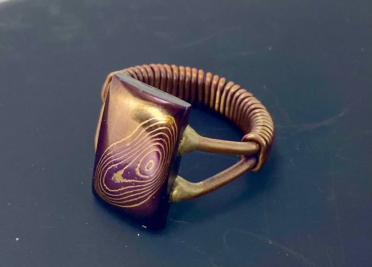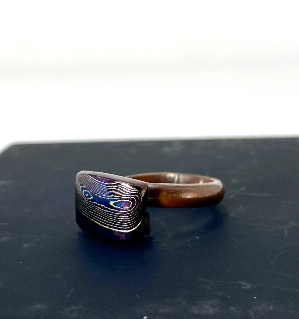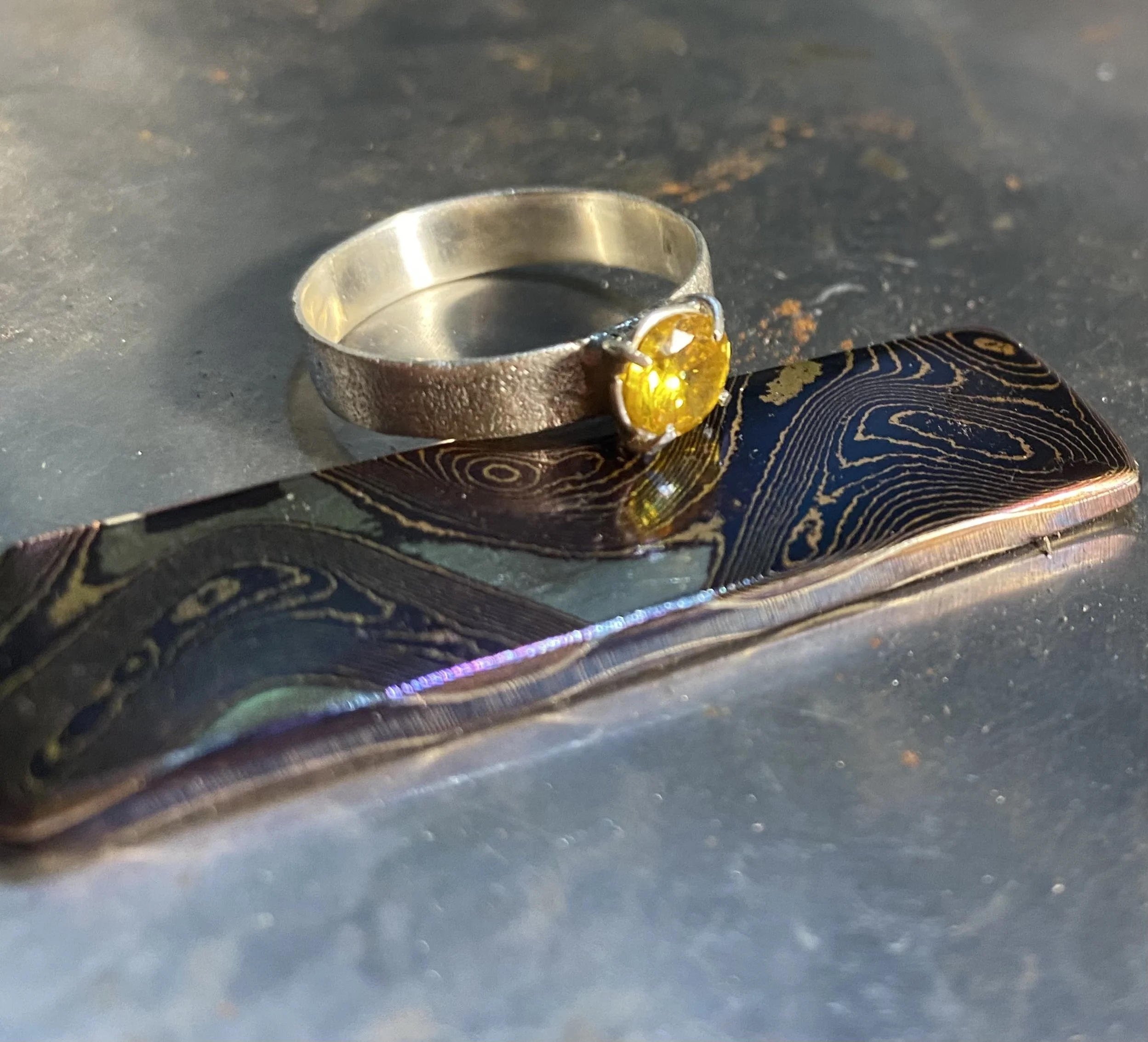 Day of the dead skull charm pendant $30.00 Sold out Damascus ring with copper band $50.00 Rectangle BF&T Damascus Ring with Wrapped Ring Band $60.00 Argentium Silver ring with yellow CZ Sale Price: $35.00 Original Price: $45.00 Sale Heat Colored BF&T Damascus Throwing Knife $75.00 Sold out Formed Soldered Mokume Cuff Bi-Color $120.00 Sold out Soldered Mokume Cuff Tri-Color $120.00 Sold out Composite Malachite set in Argentium Silver $50.00 Shield Pendant and handmade Chain Sale Price: $50.00 Original Price: $60.00 Sale BF&T Damascus Steel Claw mounted pendant $70.00 Rectangle BF&T Damascus Steel Ring W/ Argentium Band $80.00 Soldered Mokume pendant $40.00 Soldered Mokume Earrings (handmade sterlings silver ear wire) $30.00 Pair of Soldered Mokume double sided pendants $70.00 Soldered Mokume Ring W/ Argentium Silver Lining $100.00 Mokume Gane Pendant $90.00 “Tha Drip” cast sterling silver pendant on sterling chain $120.00 Cuttlefish bone cast bronze “Manta Ray” $100.00 3 Snakes Cast bronze pendant $110.00 Sterling silver hammered loop pendant $80.00 Silver Wire Wrapped Clear Quartz Crystal from $35.00 Wire Wrapped Cabochons $60.00 Premium Wire Wrapped Gemstone Donut from $45.00 Sale Basic Wire Wrapped Gemstone Donut $40.00 Rectangle BF&T Damascus Pendant from $50.00 Rectangle BF&T Damascus Steel Ring $60.00 Oval BF&T Damascus Steel Ring $60.00
